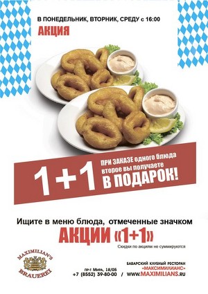 Ищите акционные предложения со значком акции «1+1» в меню!