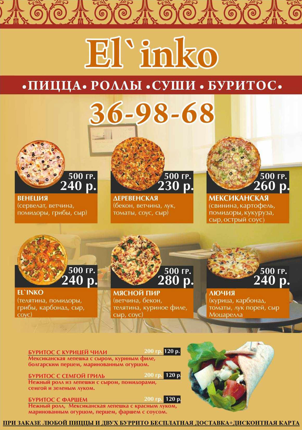 Закажи пиццу и 2 буритос, чтобы принять участие в акции! Организатор акции: кафе El'inko
